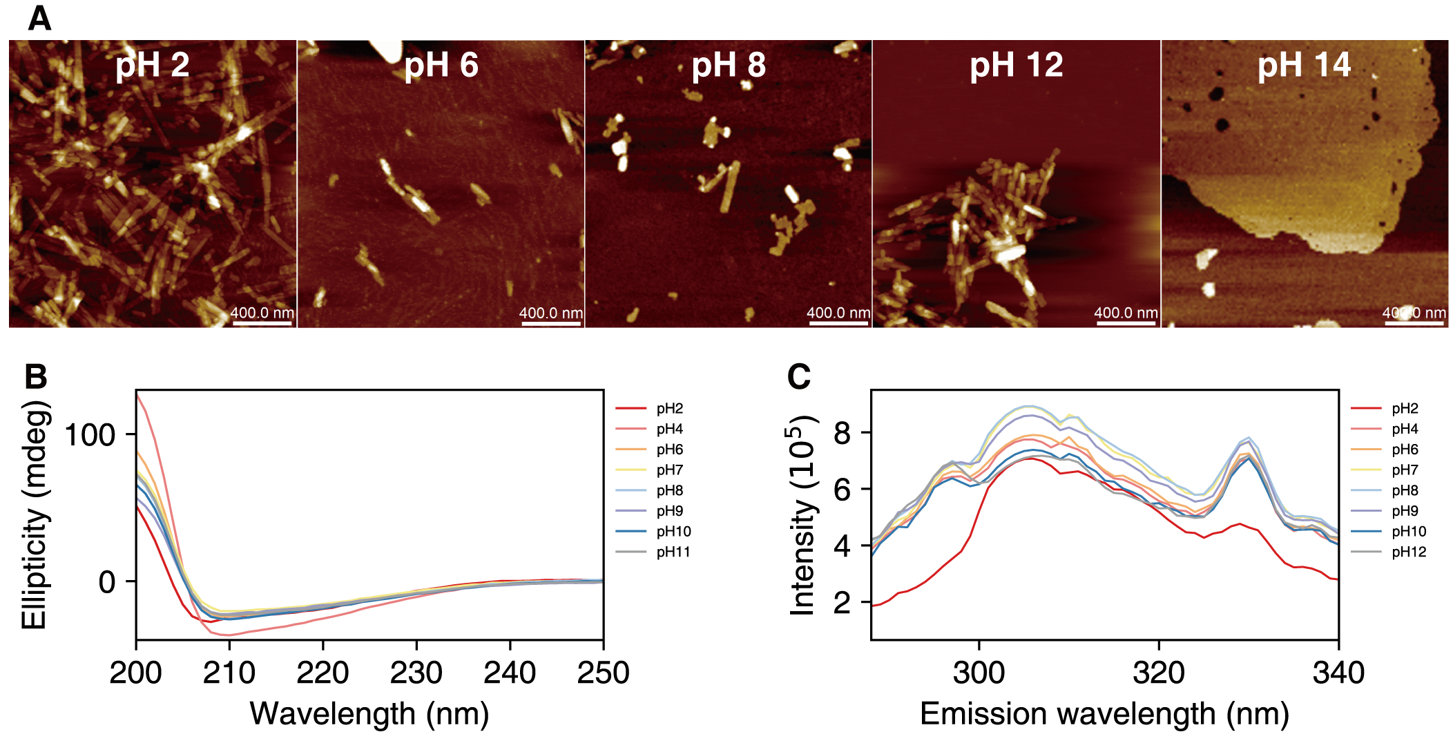 研究人员通过圆二色谱表征,证实IIQ序列在不同pH条件下均可维持其β折叠片自组装结构。与此同时,原子力显微镜等显微技术揭示了自组装结构在不同pH环境中存在显著的形态学差异;这些形态变化与多肽链的局部电荷分布及与环境的相互作用密切相关。模拟预测结果与实验验证数据的高度一致性,充分说明计算驱动方法在研究多肽自组装体结构与功能关系方面的有效性,也从原子层面揭示了pH变化如何精细调控多肽的自组装过程及其最终结构形态。