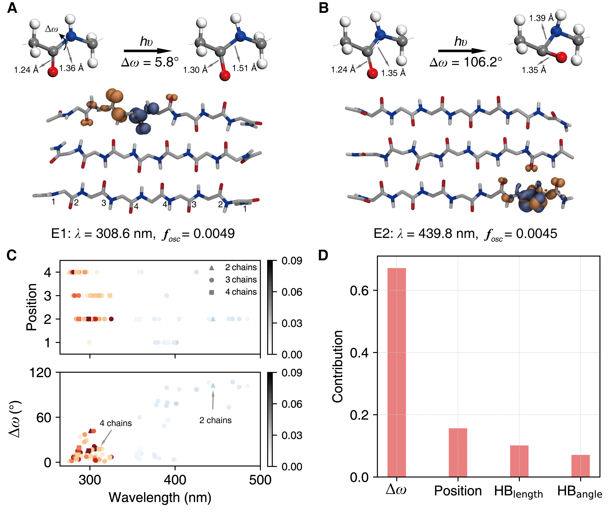 本研究观察到所有自组装体系在约305 nm处均呈现出明显的荧光峰。第一性原理计算揭示了该固有荧光峰的本质,即肽链中部的主链酰胺键在致密的氢键网络保护下受激发,经历电荷转移而产生。这种由自组装导致的主链氢键网络的结构特征显著促进了分子轨道的重叠,为电荷转移过程提供了有利的条件。