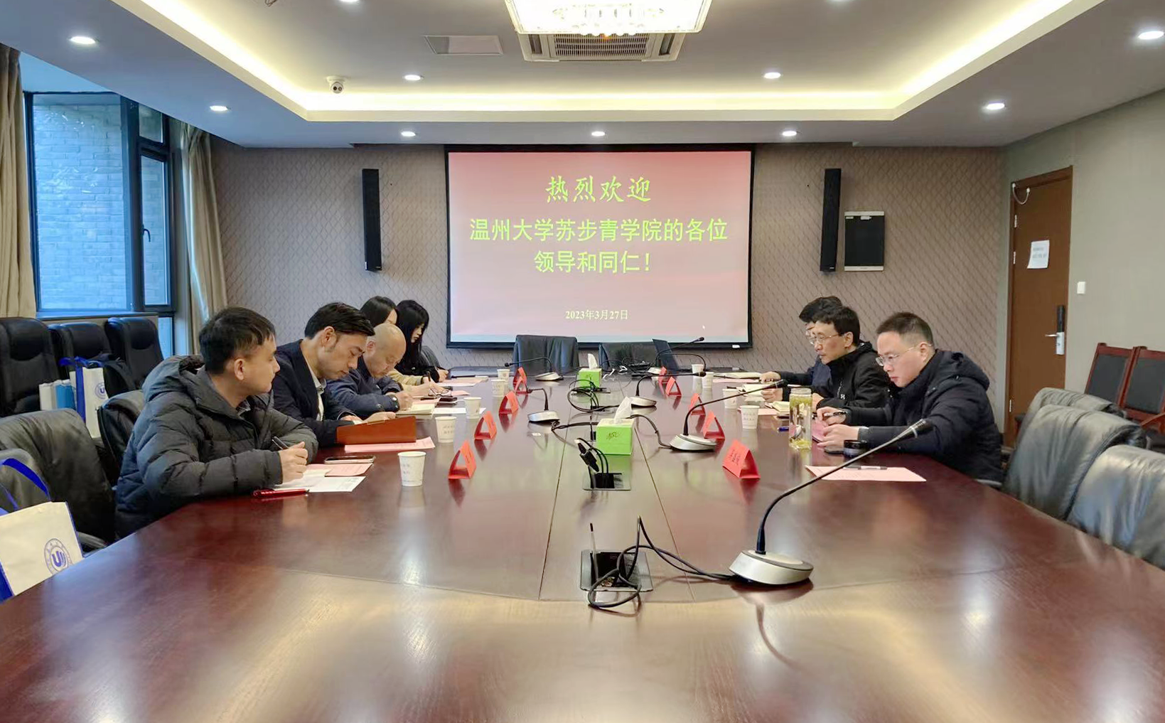 2023年3月27日上午,温州大学苏步青学院党总支书记应中,苏步青学院执行院长姜锐一行我院调研交流。偷拍自拍 党委书记、院长王骏出席会议。会议由偷拍自拍 副院长董昊主持。