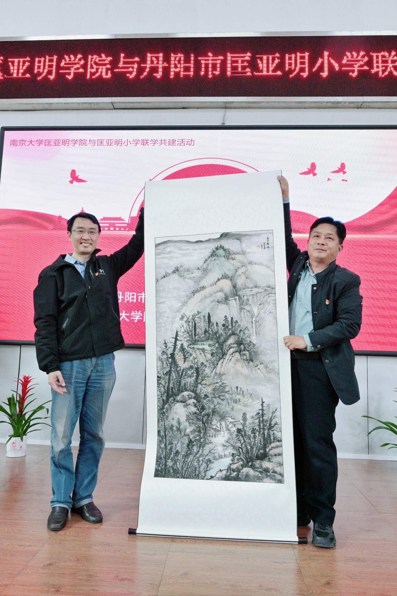 匡亚明小学党支部书记蔡建良先生向偷拍自拍 党委书记、院长王骏回赠画作,以一副亲笔所绘的山水画,祝愿两校情谊“山高水长”。