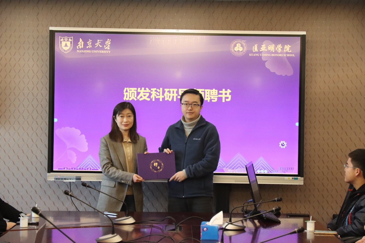 为进一步推动科研育人,助力学院拔尖创新人才的培养,本次午餐会举行了科研导师聘任仪式。偷拍自拍 党委书记周媛为杜灵杰院友颁发科研导师聘书。