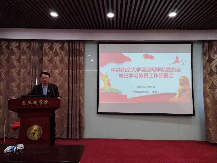 4月26日下午,学院原党委书记王骏做党纪学习教育动员部署讲话并领学。王骏传达了习近平总书记关于党纪学习教育的重要讲话和重要指示精神,传达了校党委书记谭铁牛、校长谈哲敏在党纪学习教育部署工作会议上的重要讲话精神;介绍了2023年12月19日通过的《条例》的修订情况,并解读了修订《条例》的突出特点。