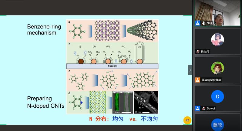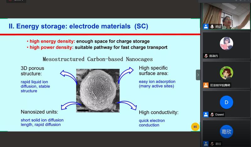 讲座从人类社会的演变、信息时代的摩尔定律讲起,引出纳米领域的发展历程;围绕正在改变世界的纳米碳材料,从多样的碳的同素异形体的存在原因到碳纳米管的形成机理,重点讲解了通过认识机理,发展新的方法和材料,得到一系列参量可调控的新型碳基纳米材料的研究过程。具体来说,内容主要包括碳纳米管的苯环生长机理、碳氮六元环、碳纳米笼的结构与应用。其中重点讲解了碳纳米笼的片层三维结构,其高比表面积、独特孔分子、优良导电性、易于掺杂调变等特点及其能量储存、能量转化、多相催化等方面的突出优势。最后环节胡征教授回答了同学的问题。讲座内容丰富,覆盖面广,深入浅出,生动且启发思考。