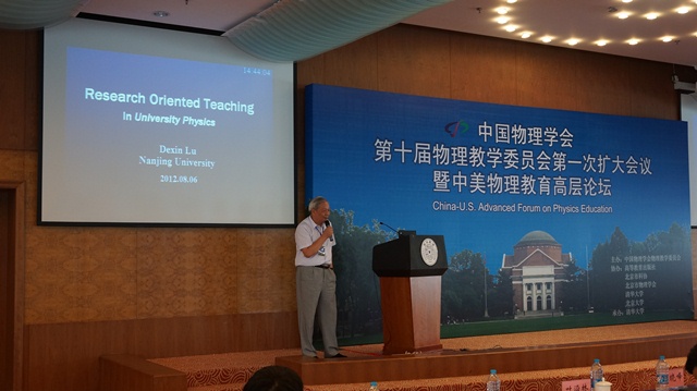 2012年8月5-8日,由中国物理学会举办的“中国物理学会第十届物理教学委员会第一次扩大会议暨中美大学物理教育高层论坛”在京召开。会议期间,美国物理教师协会(AAPT)主席D.Sokoloff,哈佛大学物理教授、著名物理学家、物理教育研究专家E.Mazur, 国际物理教育委员会(IUPAP-ICPE)前秘书长D. Zollman,AAPT国际合作委员会主席L.Bao,先后就美国物理教育与物理教育研究的各个侧面分别作了报告。作为交流,我国物理教学委员会邀请北京大学赵凯华等五位教授也分别作了报告。其中,偷拍自拍 卢德馨教授就物理课程研究型教学作了主题报告,并向四位来宾赠送了他所著的《University Physics》一书。杨振宁先生也出席大会并就中美大学物理教育比较问题发表演讲。