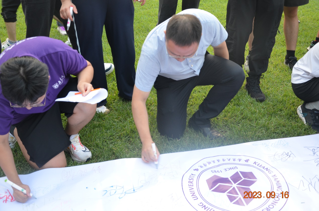 所有老师和同学在印有偷拍自拍 院徽的长幅上签下自己的名字,这张由所有23级匡院成员名字组成的全家福也就此张贴在院楼中,标志着新一届匡院学子的扬帆远航